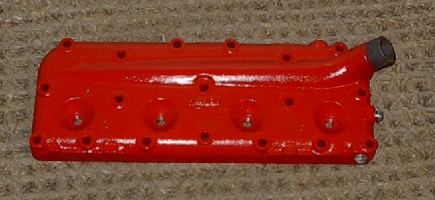 The head has received a fresh coat of New Holland Ford Red from a spray can. Since this is a side-mount distributor engine, note the mounting pads and bolts in the lower right-hand side and front for the coil bracket. The coil bracket sort of wraps around the corner. |